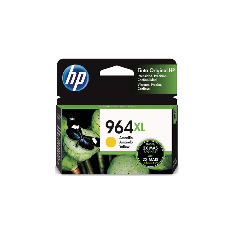 Cartucho de tinta HP 964XL color amarillo, capacidad extra para mayor rendimiento.